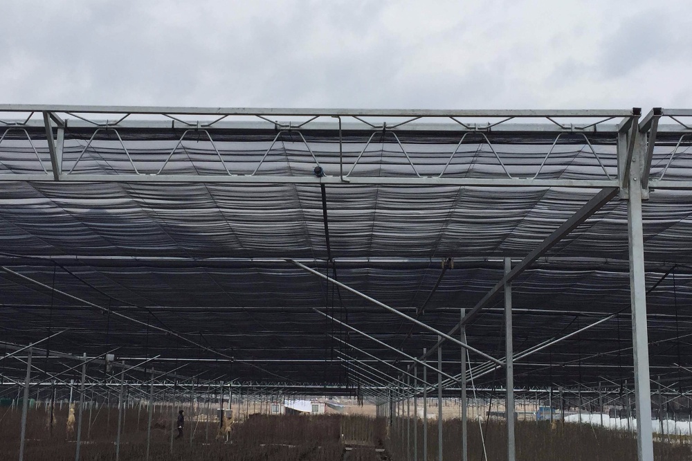 該系統實現夏季的遮陽降溫,使陽光漫射進出溫室,防止作物受強光灼傷,同時降低溫室4-6度。可選用不同遮陽率的幕布,或調節幕布的開合,以滿足不同作物的生長需求。抗紫外線、防雹、遮陽降溫。作物對光照要求有所不同,用戶在選擇遮陽幕布時應根據種植作物的種類,所在地區和所建溫室類型來配置。